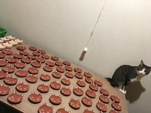 シリーズで100枚づつ注文で作らせていただいている猫豆皿、なぜかうちの猫達が気になって仕方ないみたいです。作業台が狭いのに構ってモード全開です。猫のいる場所にお送りするのでいつもより気は楽ですが、小さくて細かいモノが好きなのかな?