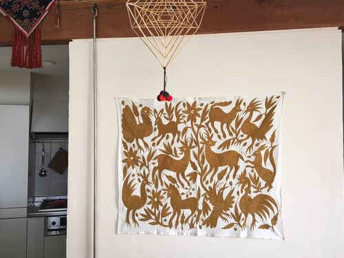 メキシコのオトミ族の刺繍がまた我が家に増えました。メキシコ人の友人が夏休みに帰省して現地で購入を頼み受け取った布です。動物の表現も惚れ惚れしますが、布の裏が職人技です。あまりにも綺麗なので、裏も見れる様に暖簾とかが良いのかな?また模様替え…